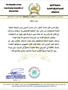 الجمعية العراقية العلمية للمخطوطات تستنكر تدمير واستهداف مركز التخطيط الفلسطيني