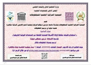 تقيم الجمعية العراقية العلمية للمخطوطات محاضرة يوم الجمعة 26 / 5 / 2023 عنوانها: (استخدام تقنيات مختلفة لإزالة الأشرطة الحساسة للضغط من المستندات الورقية التاريخية) تقدمها / الاستاذة: نرمين مصطفى شوشة (مصر)