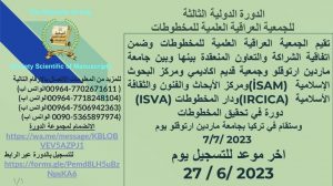تقيم الجمعية العراقية العلمية للمخطوطات وضمن اتفاقية الشراكة والتعاون المنعقدة بينها وبين جامعة ماردين ارتوقلو وجمعية قديم اكاديمي ومركز البحوث الإسلامية (İSAM) ومركز الأبحاث والفنون والثقافة الإسلامية (IRCICA) ودار المخطوطات (ISVA) دورة في تحقيق المخطوطات وستقام في تركيا بجامعة ماردين ارتوقلو يوم 7 / 7 / 2023 للانضمام الى مجموعة المشاركين في الدورة: